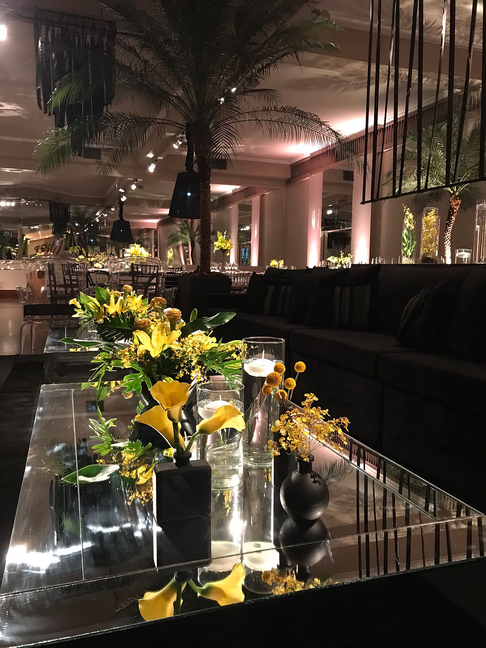 Um festa de aniversário, com uma leitura moderna com um destaque as formas geométricas em instalações aéreas em composição as paletas de preto e amarelo para as flores, bem como as peças de decoração e mobiliários.